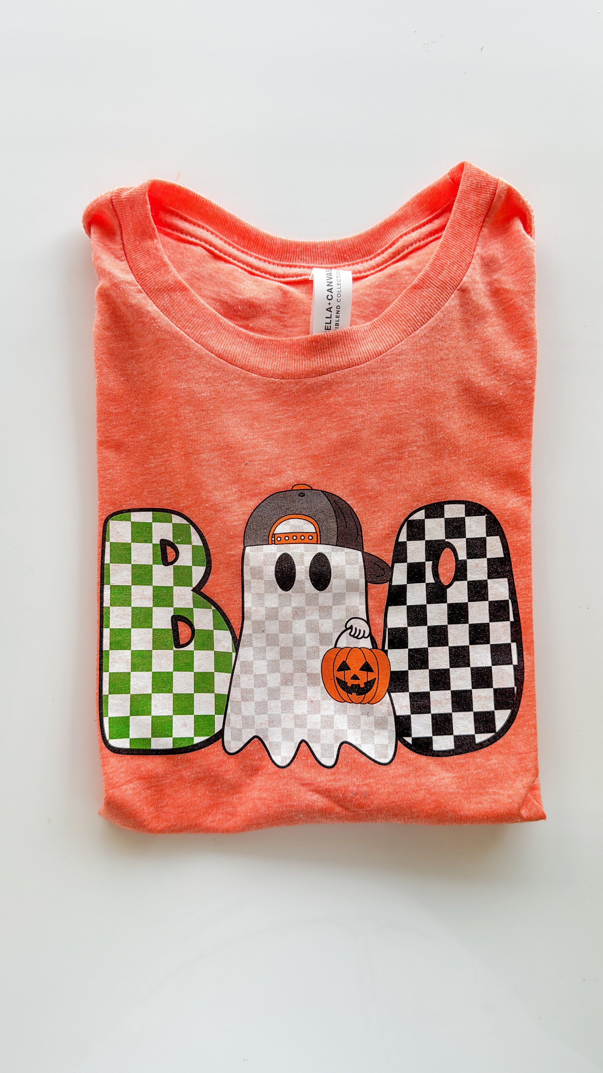 Featuring bold checkered letters, a cool ghost in a cap and a pumpkin candy bucket, this tee is the perfect mix of festive and fun.