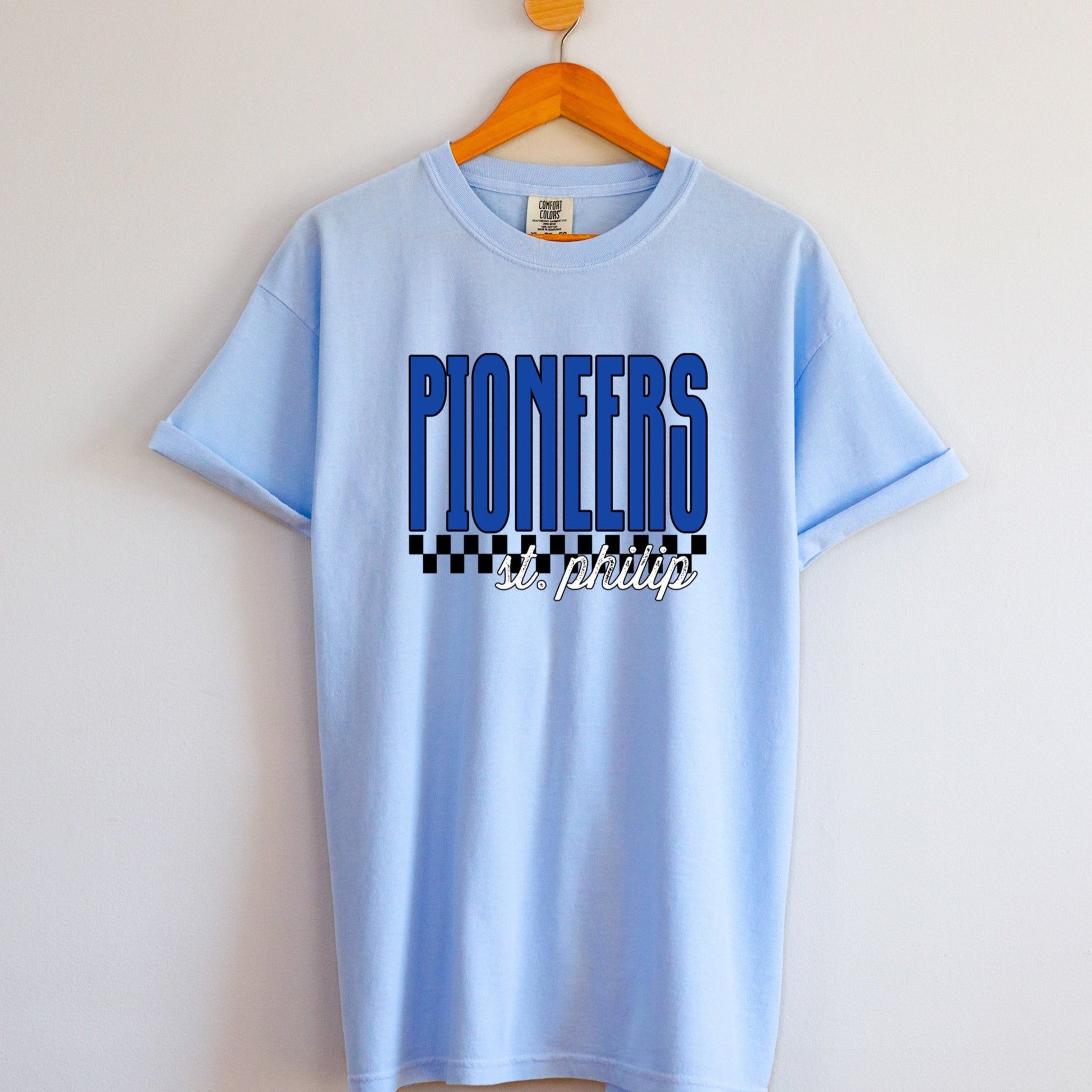 Rep your school spirit in bold style with this Pioneers checkered tee! Featuring a retro-inspired checkerboard detail and clean block lettering, this design is sporty, classic, and perfect for game days or everyday wear.